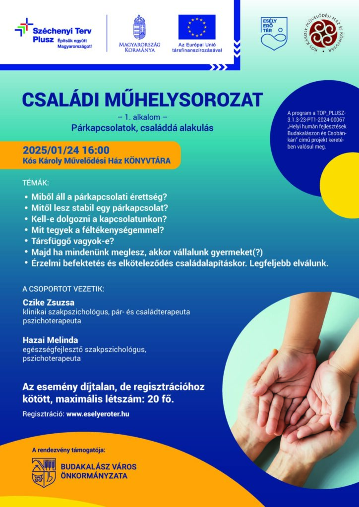 Az első alkalommal, január 24-én, pénteken 16:00-tól a párkapcsolatok és a családdá alakulás témáit járja körbe az érdeklődőkkel Czike Zsuzsa klinikai szakpszichológus, pár- és családterapeuta, pszichoterapeuta és Hazai Melinda egészségfejlesztő és pszichoterapeuta.