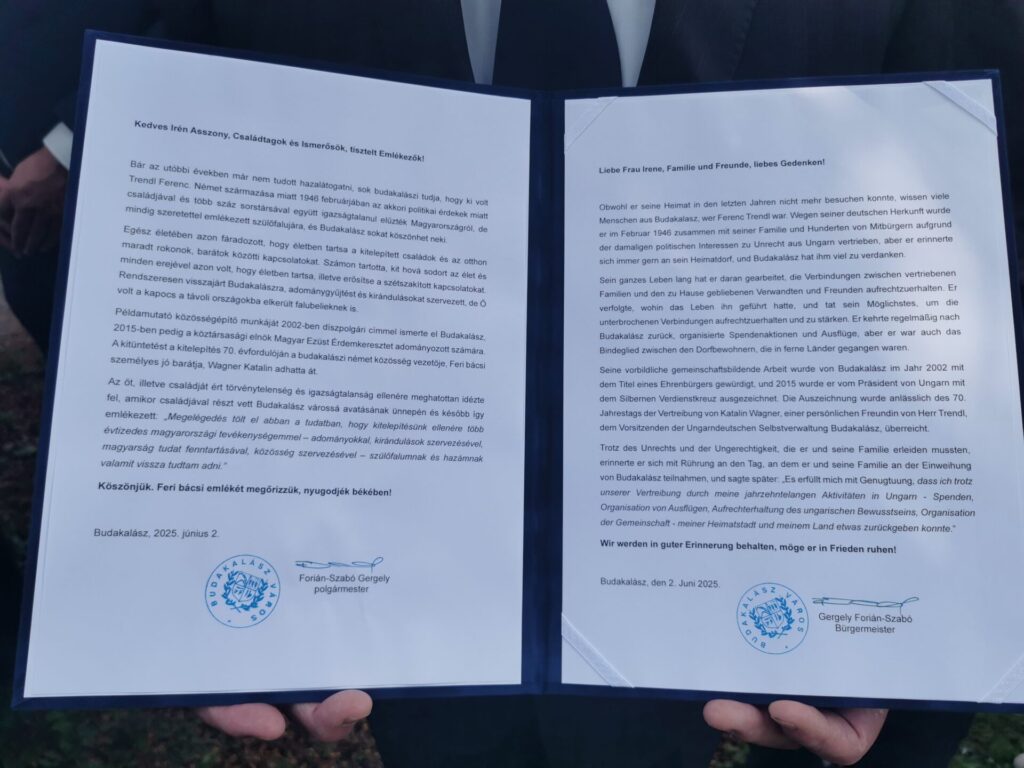 Június 3-án végső búcsút vettek Trendl Ferenctől, a sváb kitelepítés egyik utolsó szemtanújától a németországi Ludwigshafenben. Az temetéssel egy időben Budakalászon szentmisét tartottak.