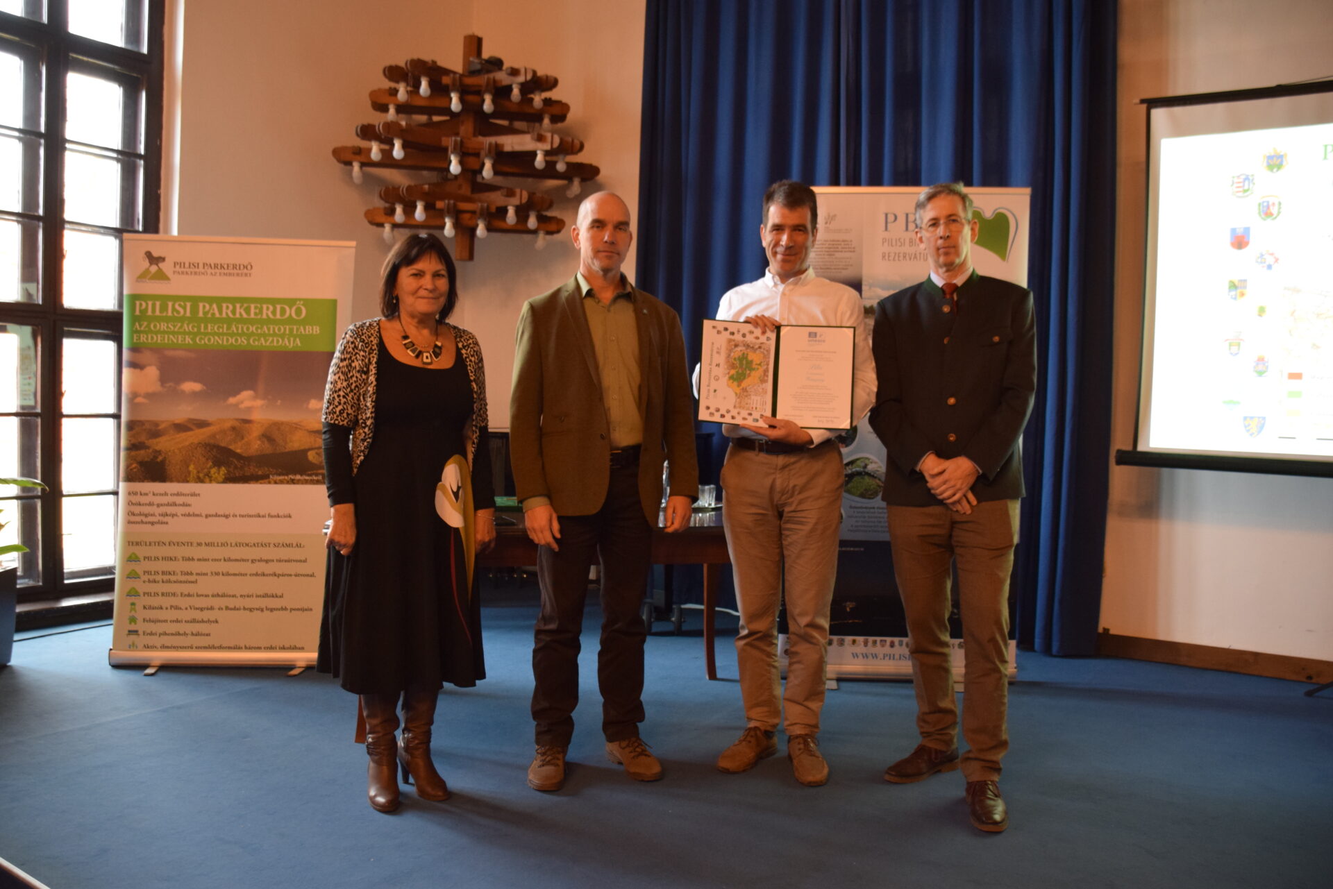 A képen balról jobbra: Érdiné dr. Szekeres Rozália, az UNESCO MAB Nemzeti Bizottság elnöke, Selmeczi-Kovács Ádám, a DINPI igazgatója, Forián-Szabó Gergely polgármester és dr. Csépányi Péter, a Pilisi Parkerdő Zrt. erdőgazdálkodási és természetvédelmi vezérigazgató-helyettese