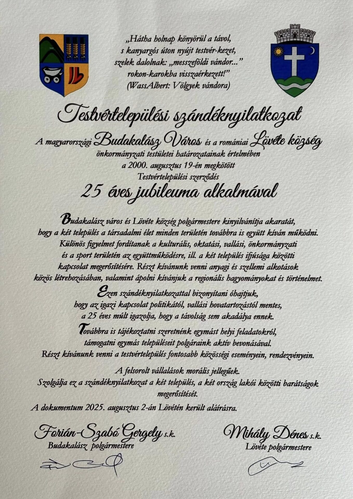Augusztusban 25 éves a testvértelepülési kapcsolatunk Lövétével. A hétvégén székelyföldi barátaink meghívására Forián-Szabó Gergely polgármester és Rehák András, a Budakalászi Testvérvárosi Egyesület elnöke ott voltak a lövétei falunapokon. A szombati megnyitó ünnepségen Forián-Szabó Gergely és Mihály Dénes polgármesterek aláírták a negyedszázados testvértelepülési együttműködés folytatásáról szóló szándéknyilatkozatot.